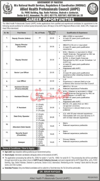 Only male candidates can apply for these Allied Health Professionals Council Jobs 2026. Qualification /Experience Required: LLB. At least 05 years post-qualification experience after obtaining a license from the Bar Council. LLB Experience in the relevant field is to be preferred after a license from the Bar Council, MBA/Fin)/M.com Relevant experience. Preferably MSc/Masters or equivalent in Allied Health Science, recognized by HEC as per Schedule-1 of AHPC Act, At eset 05 years post-qualification experience. Registered with AHPC, and more experienced candidates should apply within 15 days.