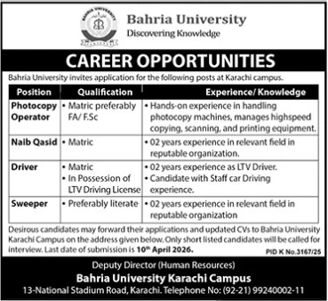 Candidates, if you are seeking the Bahria University Karachi Campus Jobs 2026, Apply Now if yes. It would be best if you tried to complete reading this Bahria University Karachi Campus Jobs because you can easily apply for these vacancies: Photocopy Operator, Naib Qasid Driver, Sweeper.