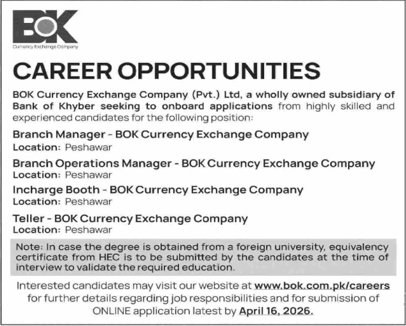 Only male candidates can apply for these BOK Currency Exchange Company Jobs 2026. Qualification /Experience Required: At least a Bachelor’s degree, BA Degree, MA Degree, FA Degree, and more experienced candidates should apply before 16 April 2026.