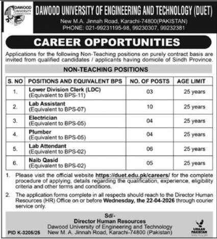 Candidates, if you are seeking the Dawood University of Engineering and Technology Jobs 2026, Apply Now if yes. It would be best if you tried to complete read this Dawood University of Engineering and Technology Jobs 2026 because you can easily apply for these vacancies Lower Division Clerk (LDC) (Equivalent to BPS-11) Lab Assistant (Equivalent to BPS-07) Electrician (Equivalent to BPS-05) Plumber (Equivalent to BPS-05) Lab Attendant (Equivalent to BPS-02) Naib Qasid (Equivalent to BPS-02).