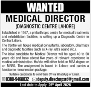 The Centre will house medical consultants, a laboratory, a pharmacy, and diagnostic facilities (such as X-ray, ultrasound, etc.). The ideal candidate for Medical Director will be aged 40 to 50 years old and have at least five years of relevant experience in medical administration. He/she will either hold an MBA degree or an MBBS. The assignment is based in Lahore and carries a handsome remuneration package, and more experienced candidates should apply before 25 April 2026.