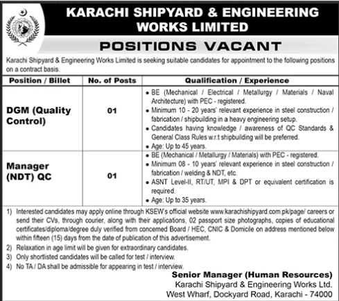 Only male candidates can apply for these Karachi Shipyard and Engineering Works Limited Jobs 2026. Qualification /Experience Required: BE (Mechanical/Electrical / Metallurgy / Materials / Naval Architecture) with PEC registration. Minimum 10-20 years’ relevant experience in steel construction/ fabrication/shipbuilding in a heavy engineering setup. Candidates having knowledge/awareness of QC Standards & General Class Rules w.r.t shipbuilding will be preferred. Age: Up to 45 years, and more experienced candidates should apply within 15 days.