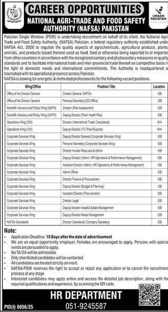 Candidates, if you are seeking the Latest Pakistan Single Window Jobs 2026, Apply Now if yes. It would be best if you tried to complete read this Latest Pakistan Single Window Jobs because you can easily apply for these vacancies Director General NAFSA Personal Secretary (DG Office Director Risk Assessment Deputy Director (Pant Health Risk Director (International Trade Compliance) Deputy Director (ITC Part Exports Deputy Director General (Corporate Services Wing) Personal Secretary (Corporate Services Wing Drector Human Resource & Admin Deputy Director (Admin, HR Operations & Performance Management) Assistant Director (Admin, HR Operations & Performance Management Admin Officer Director Finance & Procurement Deputy Director Budget & Planning) Assistant Director (Procurement) Director Legal Deputy Director Asset & Estate Management Deputy Director Media Management Director Secretariat (Company Secretary).