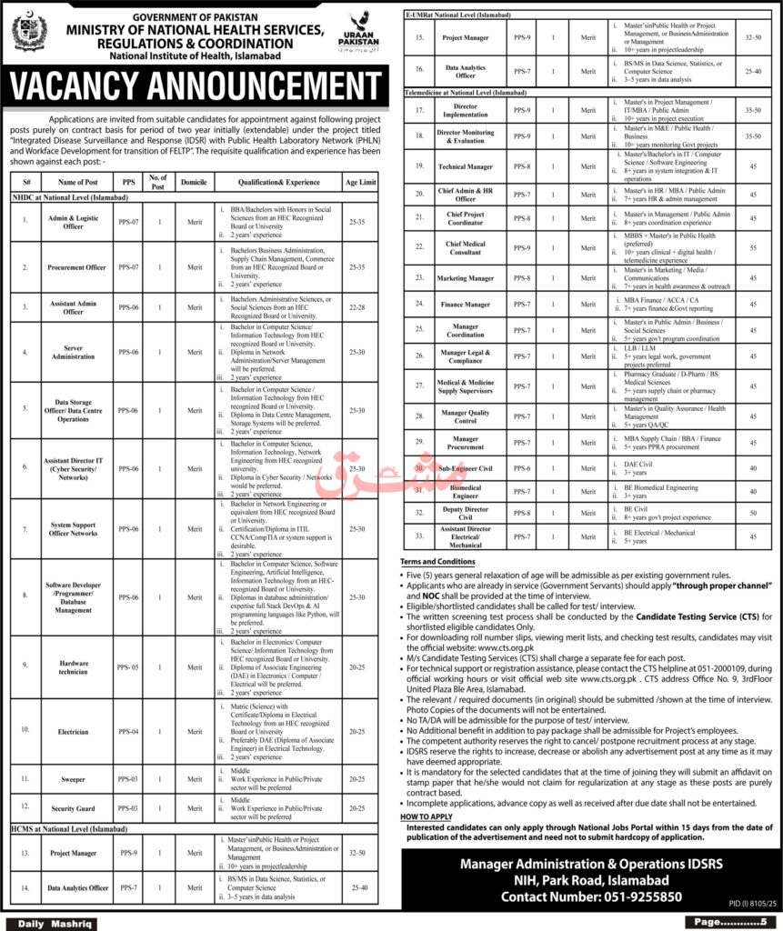 Candidates, if you are seeking the National Institute of Health Jobs 2026 in Islamabad, Apply Online if yes. It would be best if you tried to complete read this National Institute of Health Jobs 2026 In Islamabad because you can easily apply for these vacancies Chief Project Coordinator, Chief Medical Consultant, Marketing Manager, Finance Manager, Manager Coordination, Manager Legal & Compliance, Medical & Medicine Supply Supervisors, Manager Quality Control, Manager Procurement, Sub-Engineer Civil, Biomedical Engineer, Deputy Director Civil, and Assistant Director Electrical/ Mechanical.