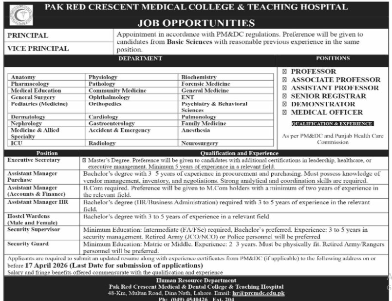 Vacancies Details of Pak Red Crescent Medical College Jobs 2026