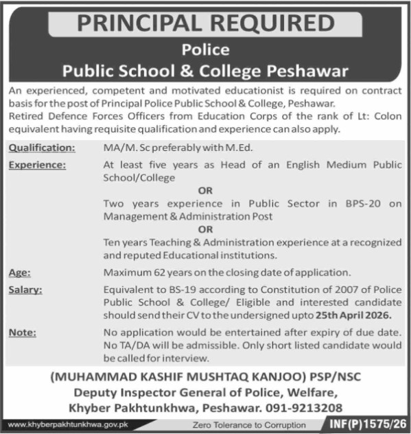 Both female and male candidates can apply for these College Peshawar Jobs 2026. Qualification /Experience Required: MA/M.Sc preferably with M.Ed. At least five years as Head of an English Medium Public School/College OR Two years of experience in the Public Sector in BPS-20 on Management & Administration Post OR Ten years of teaching and administration experience at a recognized and reputed Educational institution. Maximum 62 years on the closing date of application, and more experienced candidates should apply before 25 April 2026.