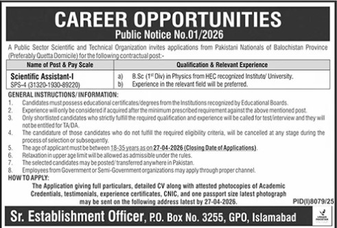 Candidates, if you are seeking the Public Sector Technical Organization Jobs 2026 in Islamabad if yes. It would be best if you tried to complete reading this Public Sector Technical Organization Jobs because you can easily apply for these vacancies, Scientific Assistant.