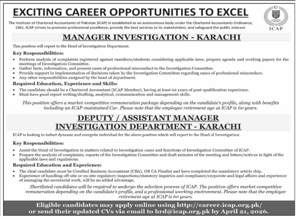 Candidates, if you are seeking the Institute of Chartered Accountants of Pakistan Jobs 2026 if yes. It would be best if you tried to complete reading this, The Institute of Chartered Accountants of Pakistan Jobs, because you can easily apply for this vacancy, Manager Investigation.